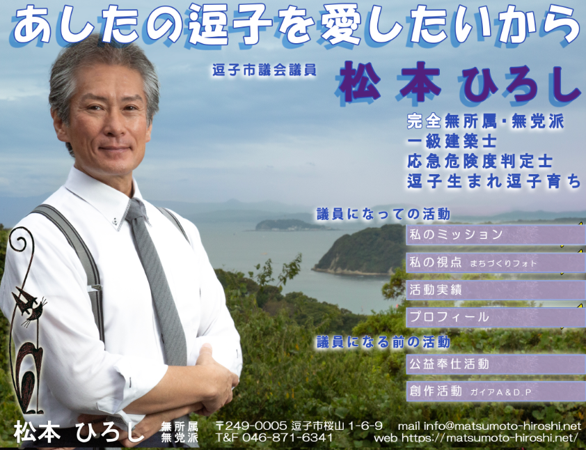 私は、逗子生まれ逗子育ちの建築家・デザイナーです。 自らの職能と二十年来の公益奉仕活動の経験、そして何より郷里への愛情をもって「逗子ならではの豊かさ」を追求します。